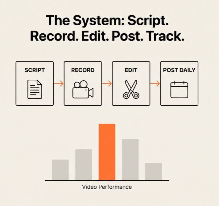 Script first. Record in batches. Hire an editor. Post daily. Track data. Double down on what works.