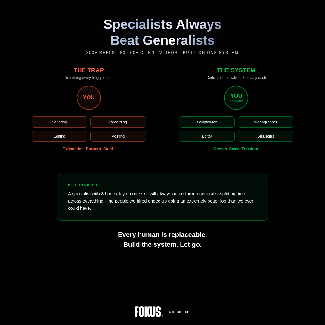 This is where most business owners suffer. We think we know best, so we do everything ourselves. We believe we are the only ones who can write our scripts, edit our videos, and hit publish. It's a constant loop of 'me, me, me.' But that thought process is a trap that keeps businesses stuck.