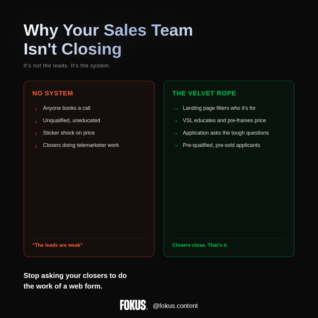 This system acts as a velvet rope. It repels the tire-kickers and the time-wasters, and it rolls out the red carpet for your ideal clients. By the time a prospect books a call, they are not a cold lead. They are a pre-qualified, pre-educated, and pre-sold applicant. Your sales team’s job is no longer to sell, but to see if it’s a good fit. Stop asking your closers to do the work of a web form. Fix the system.